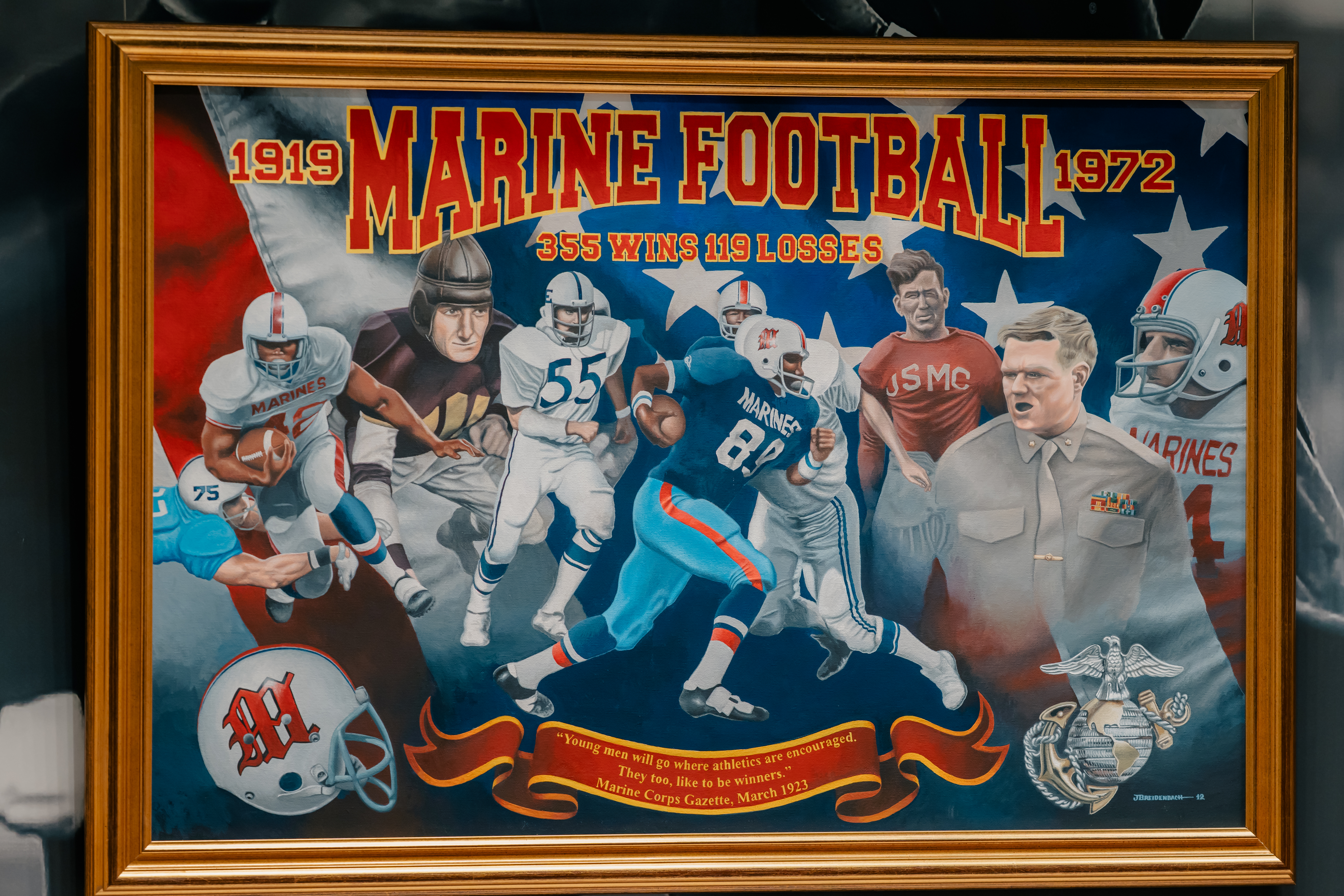 On January 28, 2026, the National Museum of the Marine Corps celebrated the official ribbon-cutting for its newest exhibit, Marine Football, honoring over 50 years of Marine Corps football tradition. The ceremony featured remarks from distinguished leaders, including Brigadier General Matthew Tracy, USMC, Lieutenant Colonel Ronald Eckert, USMC (Ret.), and Colonel Keil Gentry, USMC (Ret.), each highlighting the rich legacy of teamwork, resilience, and service embodied by Marines on and off the field. The event also included a performance by the Quantico Marine Band and the debut of the centerpiece painting, Semper Fi on the Field, by artist Jason Breidenbach.